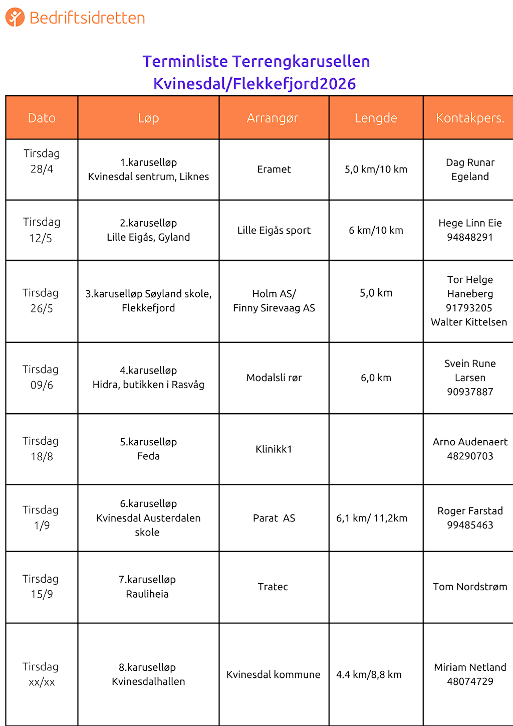 Terminliste 2026 Terrengkarusellen i Kvinesdal/Flekkefjord